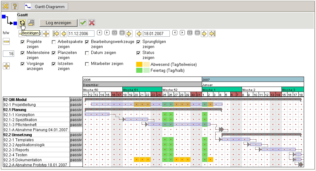 Das Gantt-Diagramm in der Projektplanung beinhaltet zahlreiche Optionen. Im oberen Bereich stehen beispielsweise die Reload-Funktion, der Druck-Modus und das Ereignis-Log zur Verfügung.
