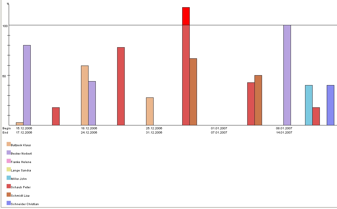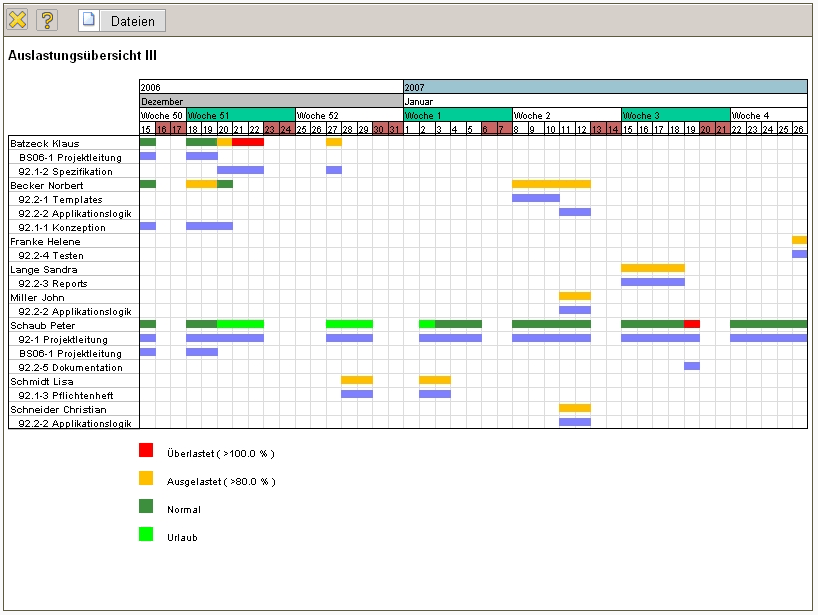 Diese Auswertung generiert mitarbeiterbezogen eine Übersicht über alle Aufgaben der Mitarbeiter und ordnet diese gemäß ihrer Planzeiträume an. In der ersten Zeile der Mitarbeiter sind dabei die Auslastungen der Mitarbeiter in drei Kategorien (rot - überlastet, gelb - ausgelastet und grün - normale Auslastung) dargestellt. Die Schwellwerte können vom Benutzer (obere Auslastungsgrenze und untere Auslastungsgrenze) eingestellt werden. Darüber hinaus enthält die erste Zeile pro Mitarbeiter auch die geplanten Abwesenheiten (im Beispiel Urlaub).