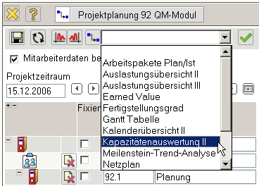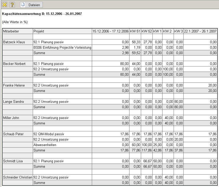 Die Kapazitätenauswertung II generiert mitarbeiterbezogen eine Übersicht über alle geplanten Aufgaben der Mitarbeiter für beliebige Perioden im Betrachtungszeitraum.