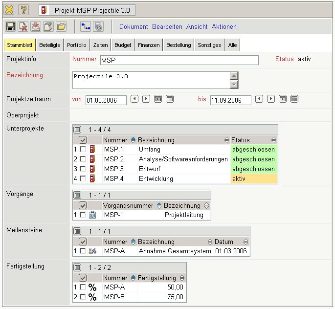 In the project desktop, all project-orientated data (project structure, milestones and allocative relations) and project-orientated trend estimations (status, deadlines) are administered.