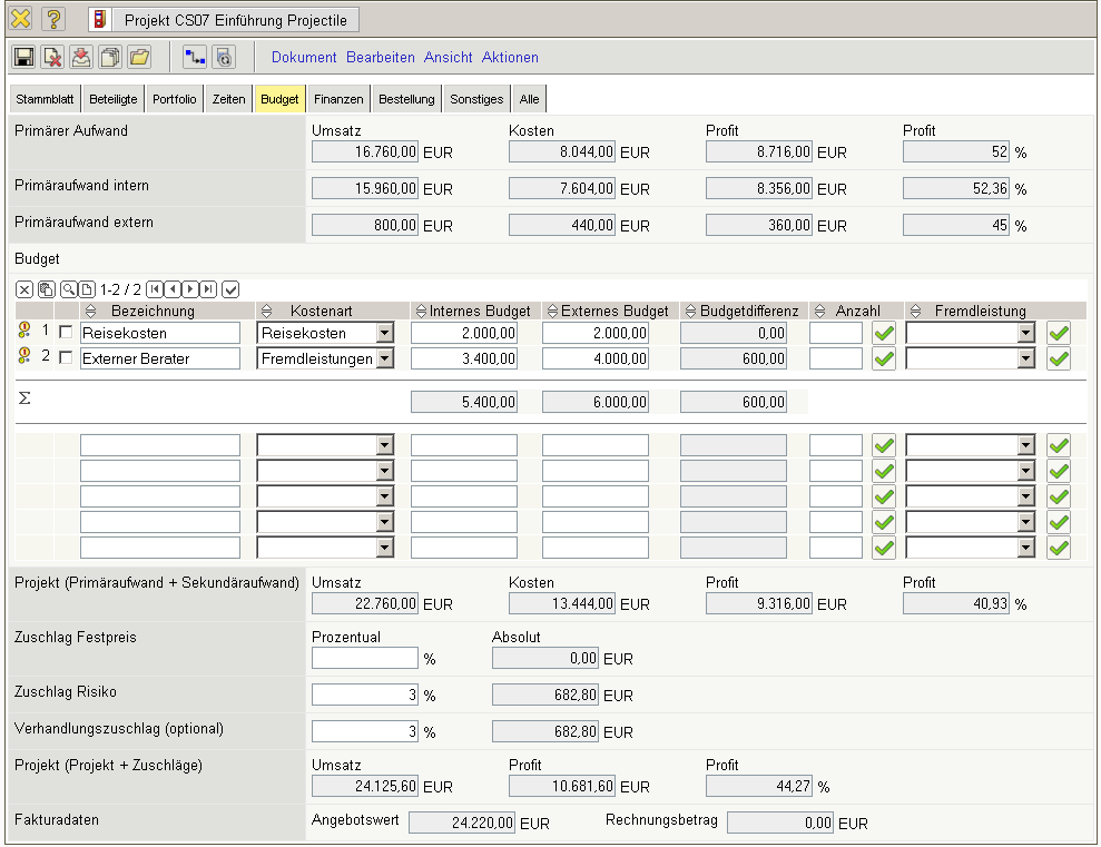 Projectile automatically determines the working budget from the entered data of the job definition. In the scope of budget planning (see illustration 9), all other budget posts are planned in the next step; for example, travelling, material and foreign cost budgets.