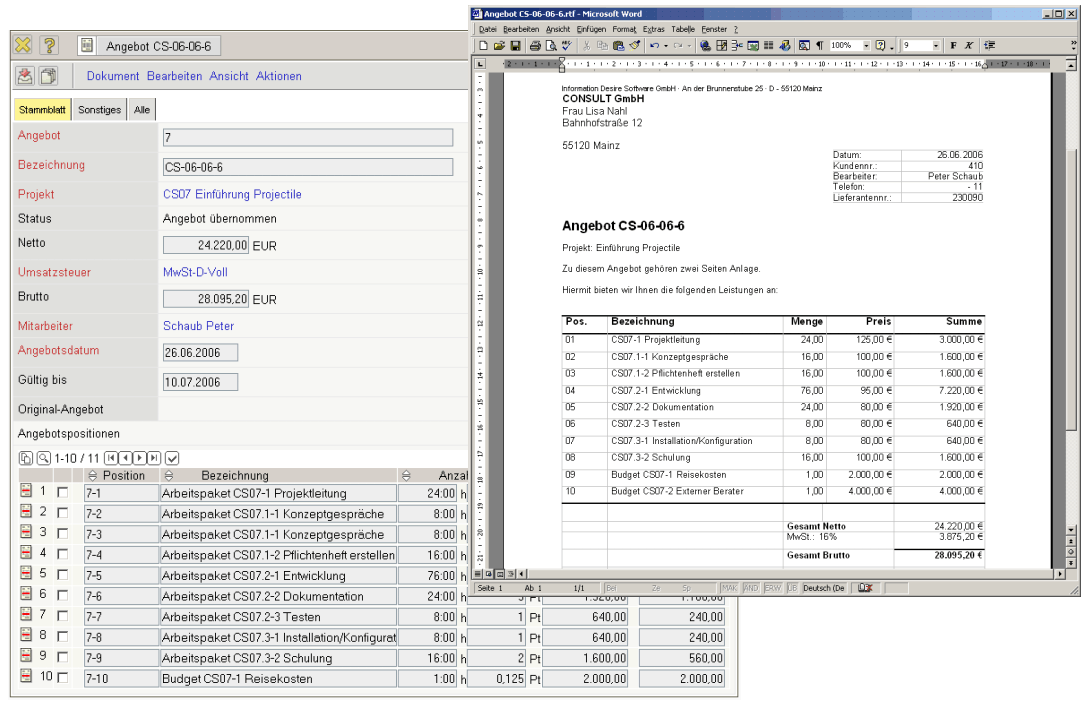 After the definition of a project, you obtain the possibility in the invoicing module to make up offers from the plan data of the project structure and the data from the budget management. The offers are calculated for the specific customer from the defined project data (estimation of effort and budgets). The individual offer positions can be modified as you wish. After being drawn up, the offers can be printed out (see illustration 10).