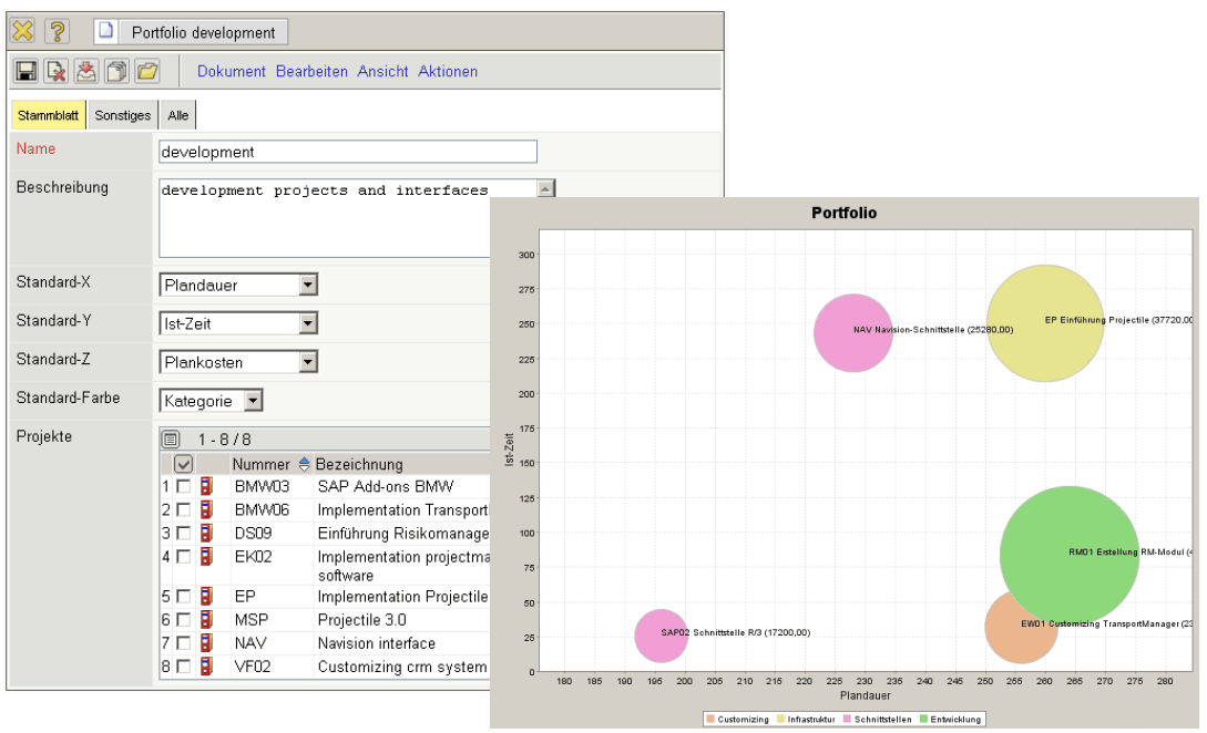 The basis of the portfolio management is the compilation of projects. In the portfolio desktop, the projects can be compiled and the axes for the analyses be pre-defined. The indexes for the axes are, for example, plan effort, actual performance, plan turnover, value of offer, amount of invoice, probability and status, risks, use, classes and further criteria.