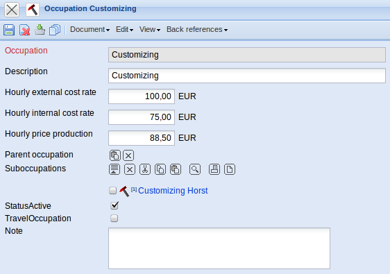- Occupation: This alphanumeric field defines distinctly the occupation, in which one external and two internal hourly rates can be assigned.