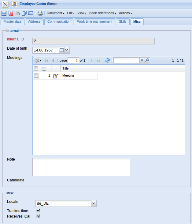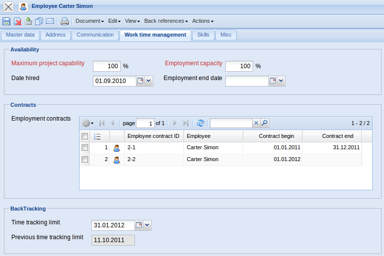 - Employment Contract: The employee's contracts are specified in this selection list. Employee contracts can be defined for a time period (see also Working Time Administration):