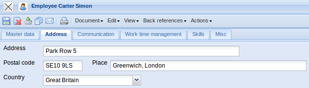 The Employee form administers the master data of each individual project employee. All information about the employee, e.g. personnel number (ID), the designated user group, the system login password, the employee's status, the location, the employee's name and address, department and function, types of communication, as well as the Working Time Administration are stored here.