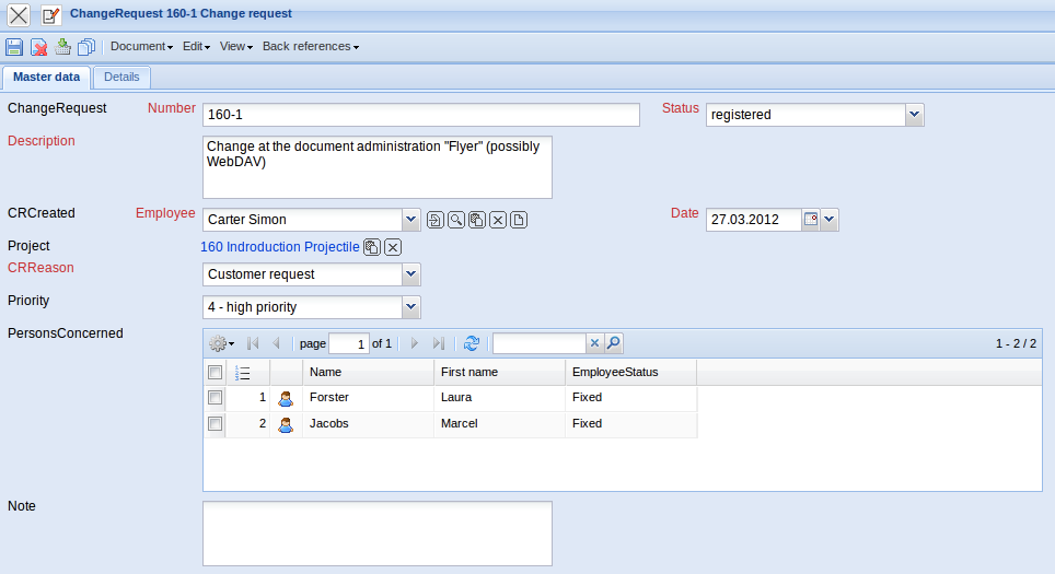 - Change-Type: This field designates the type of the project change (general reason, request from the customer, errors, IT issues, market changes, …). The change-type can be defined and changed in the collections (CRReason).