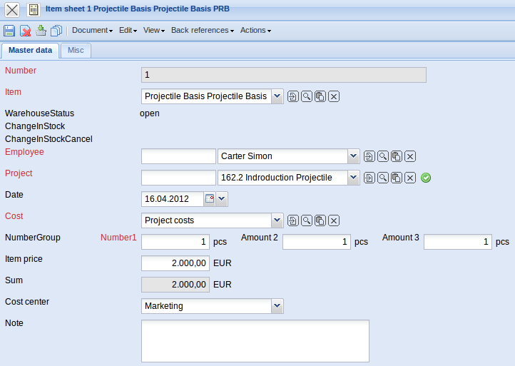 Using the item sheet form, project-related invoicing/charging of external services and/or items are possible. The amount of defined external services (for example, items or licenses) in the the Main Data module are assigned to a project. The sales price is pre-occupied with the suggested retail price of the item and the appropriate total price is displayed.