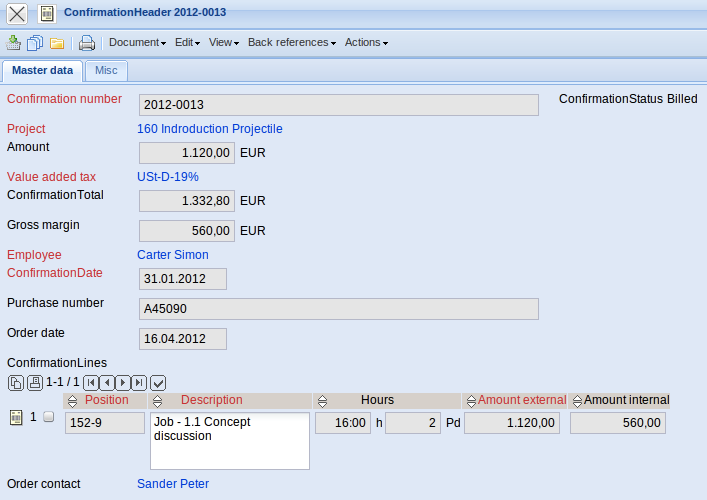 The Order Confirmation form administers the customer's orders. After an offer has been accepted, the order information can either be directly entered into the project or an order comfirmation can be created. This order confirmation is needed by projects, which are not ordered as offered.