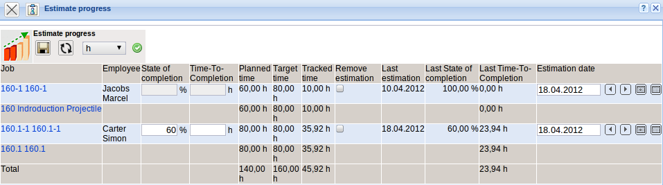 For project controlling either the grade of completion or rest time/effort is needed as a benchmark. These evaluations can be stored in TimeTracker (from the employee) or in the dialogue “estimate completion” (for example, from the project leader). Furthermore, grades of completion can be stored in the project (see also the project and grade of completion forms).
