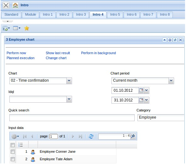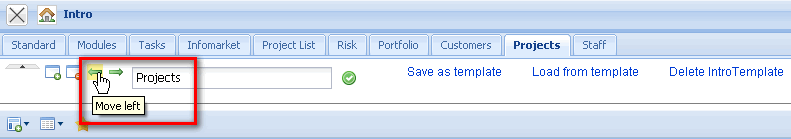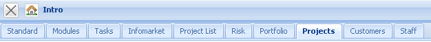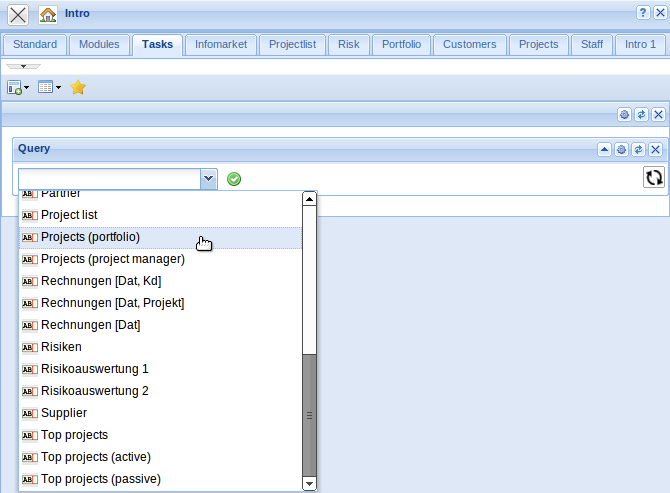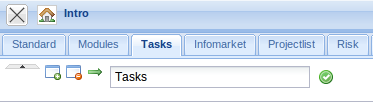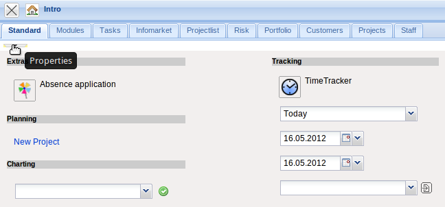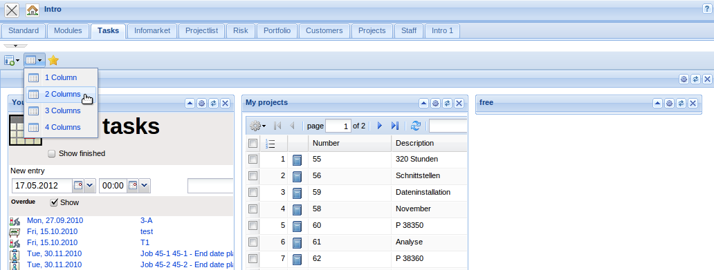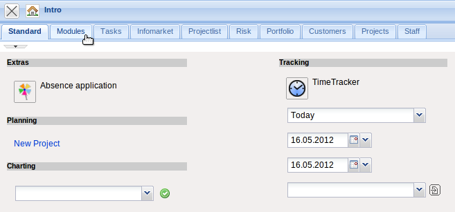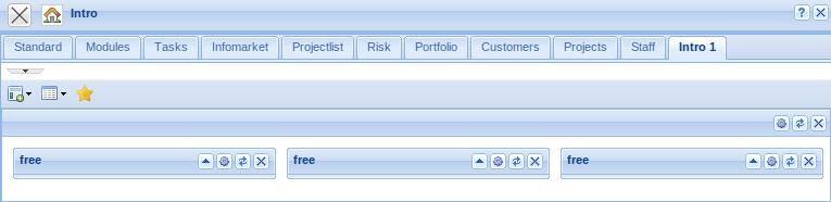 In the lower part of the intros, contents can be defined, which can then be displayed. Predefined forms as My projects, Your tasks, My dates and the modules Info market and Classic intro can be selected.