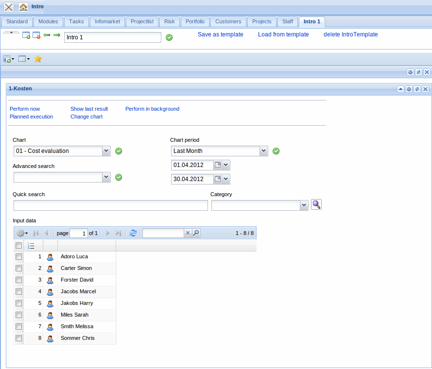 Using the option “My Intro” each user can directly access all important overviews and reports generated from the user. The intro screens can be configured through the properties function. Here, various intro screens can be named and the plug-ins can added. In the current Projectile version, various personalized intro screens and further functionalities for these intro screens are available, for example, for appointments (including actions, milestones and jobs) and queries from advanced search (Profi-Suche).