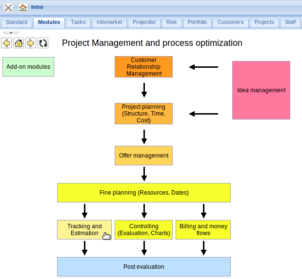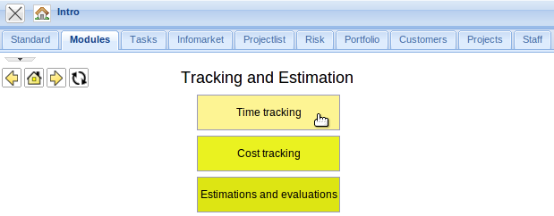 The application can then be used by clicking on the element in the process overview. In the example, the user changes to the “tracking and estimation” view …