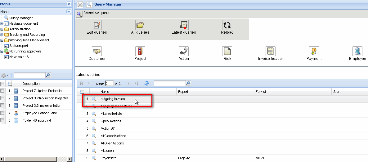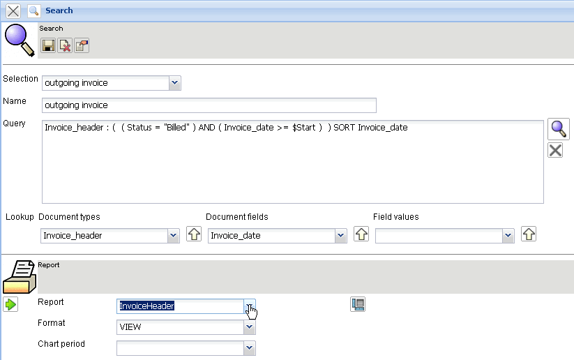 Reports can also be added to the advanced search. If the ReportMaker is licensed, the reports can also be assigned to queries. In the example, an existing report with the name “InvoiceHeader” is assigned to the query, and the output format “VIEW” is selected.