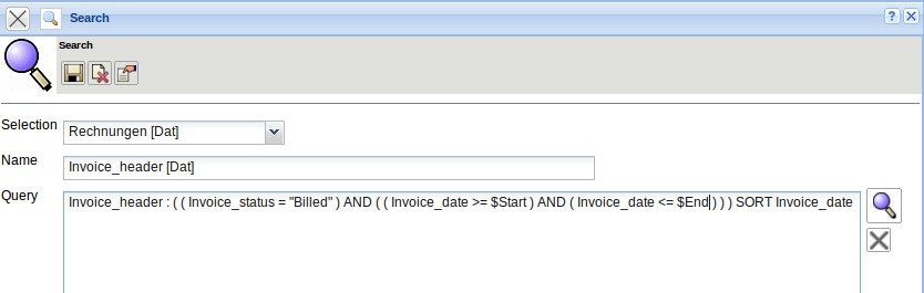 The queries of the advanced search can also be more complex. The following example finds all the billed invoices during the period of start (>= $Start) to end (< = $End):
