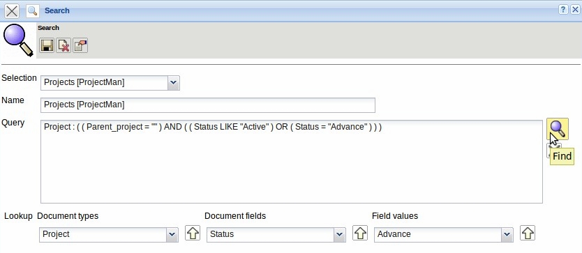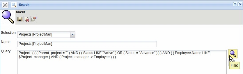 As an extension of the query, the field project manager in the document project is searched for with an AND-Link. This field is a multiple selection and contains many numbers of entries of type employee. Employee.Name LIKE $Project Manager queries the field name (last name) in the document employee and the requirement Project Manager → Employee (field project manager points to employees) provides for the assignment to the field project manager.