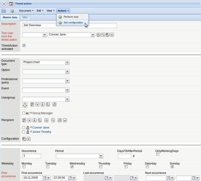 Then the description field is filled out and a document type is selected (here project chart). Then the recipient of the timed action is determined. Individual employees and groups (here all users of the group “manager”) are defined as recipients of the timed action.