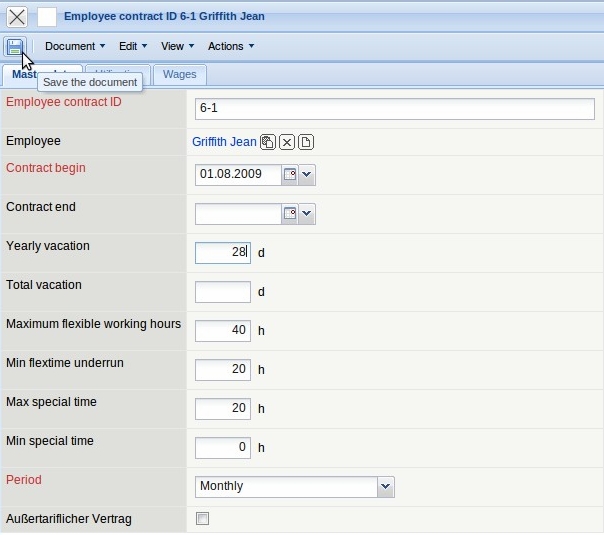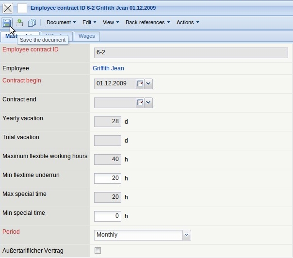 In the example, an open-end contract is defined for the employee Jean Griffith (valid from 01.08.2009). The charge rate for the employee is EUR 55.00 (the employee causes costs of 55 EURO per hour), the vacation entitlement is 28 days per calendar year. Additionally, the flexible time and special-hour intervals with the associated period are defined. The employee can only accumulate maximum 40 hours overtime per month and 20 special hours. Further information in the contracts is based on available working time and capacity of the employee (max. working time = 100% corresponds to a full-time job and 75% to ¾-time job). The other information regards the salaries and the non-tariff salary.
