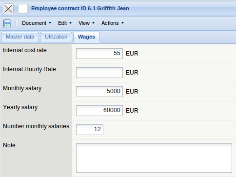 For each contract, an internal cost rate and internal hourly rate can be defined for the employee (see also employee administration and pricing- and costing).