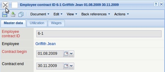 Per employee, any number of contracts can be defined. The contract dates may however not overlap. In the following example, the first contract of the employee, will expire on 30.11.2009. After clicking the action “set time” …