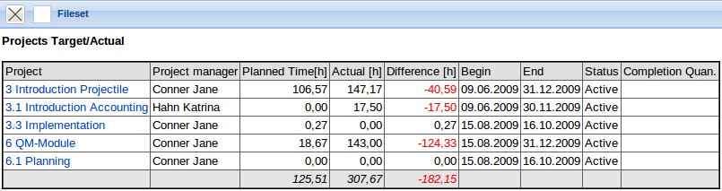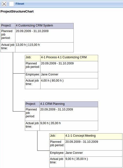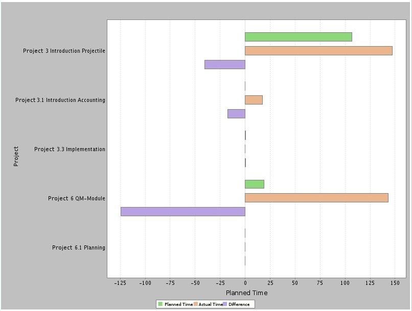 The project chart implements the project-related charts. This includes the project overview chart, the work breakdown structure (project structure plan), target/actual comparison chart for projects and jobs, the milestone-trend-analysis chart, the visualization of degree of completion, time sheets and a skill matrix.