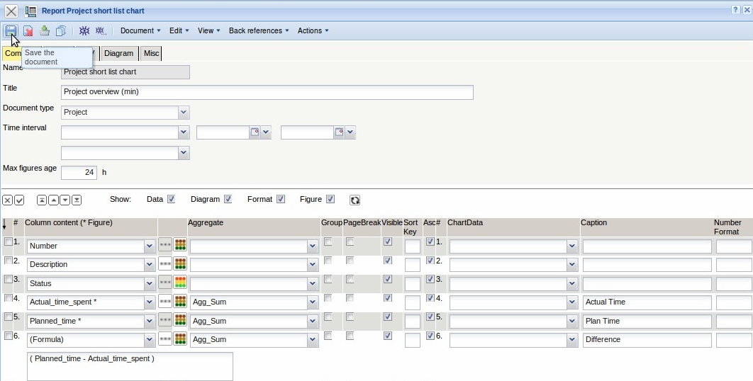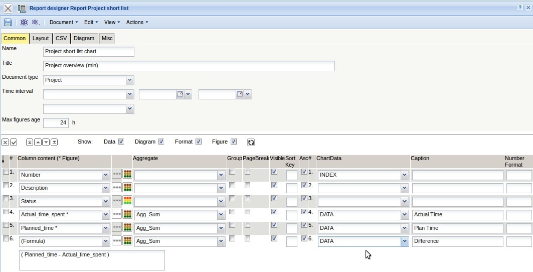 In the column chart data, the axes need to be determined for the 2-dimensional chart with x-and y-axis. The x-axis (horizontal) is determined with index (x) and the values for the y-axis (vertical) is determined with data (y). In the example, the values planned time/effort, actual time/effort and the difference (formula) for the projects (Number) should be plotted.