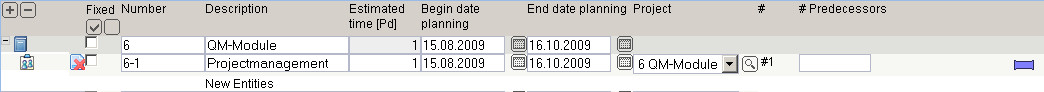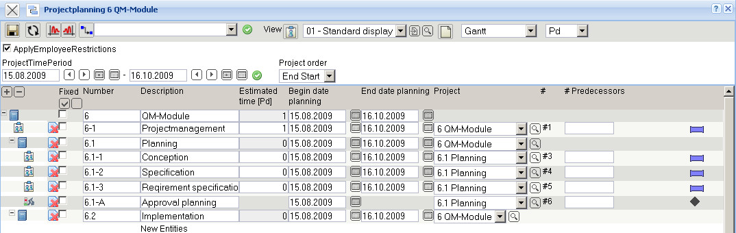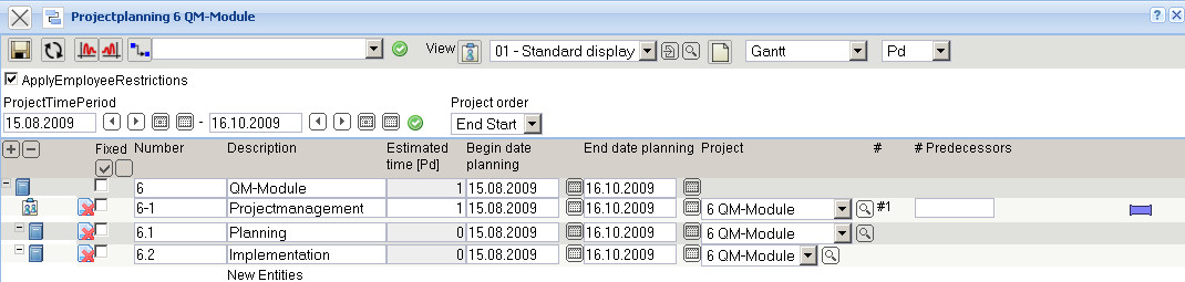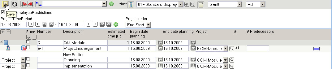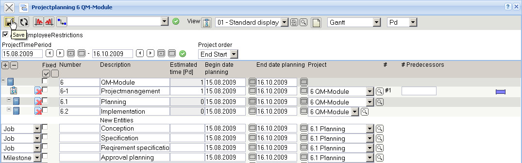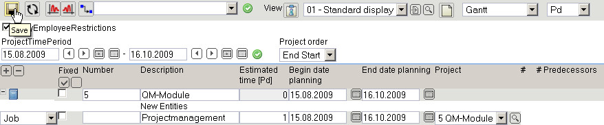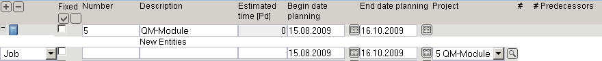 In the following example a job “Project management” with the estimated time/effort of 5 Pd (Person days) is planned for the project “Create QM-Module”.