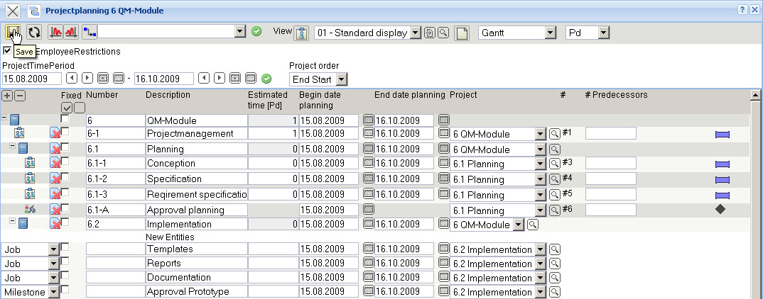 After the definition the project plan is saved and on the right side of the dialogue, functionalities for defining the order relationship is supplied from the system. These columns are used for defining the order relationships between individual jobs and/or milestones.