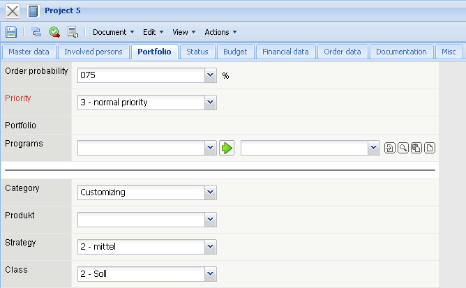 After defining the fields in the “Involved Persons” tab, the “Portfolio” tab is displayed. The priority, project type, project probability and further attributes are defined here. Probability is used for the suggestion scheme and the attributes are used as classification characteristics and can be used as selection criteria for the evalaution charts.