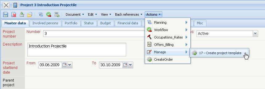 Using the action “Creating a template”, a template can be created from an existing project. This template contains the complete project structure (sub-projects, jobs, jump sequences, milestones and budgets) in parametrical form. The absolute dates (plan start and plan end) become relative dates dependent on the parameter generated from the project assistant.