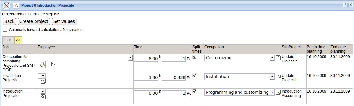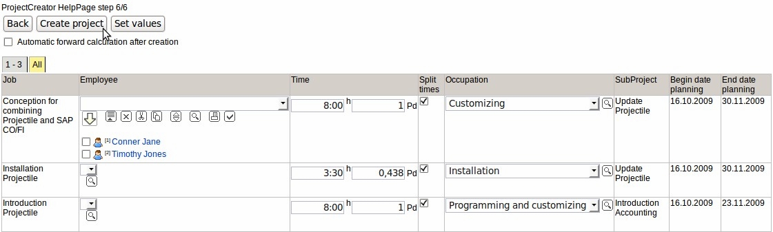 For tasks with several employees the option “split times” can be applied. Using this check box, it can be specified if the employees split the defined planned time or if each employee utilises the given amount of hours for his/her job. Also, the assigned occupation of the job can be modified. Modifying the start dates and end dates is not possible here. This and other modifications with the structure can be directly applied after generating the project.