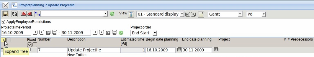 In the example, a parent project and a sub project, various jobs and milestones, as well as order relationships between the tasks have been created. Using the function “Expand Tree”, the complete structure can be displaye: