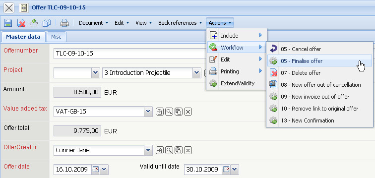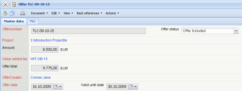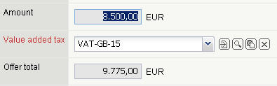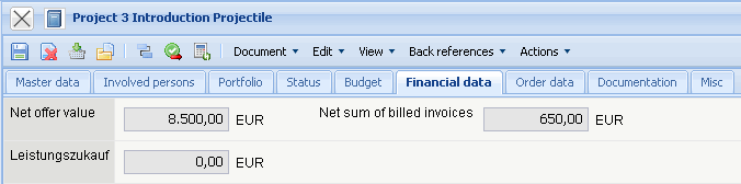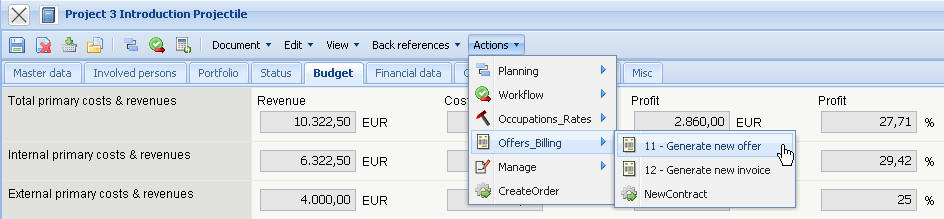 On the budget tab the subtotal of the offer is also transfered into the element offer value. At the same time the system also updates the invoice amount in the invoice.