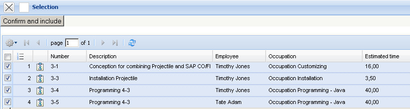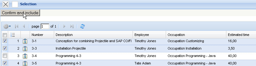 … every job for the project (including every sub-project) will be listed. By marking the appropriate items and by activating the action “Include jobs”, selected jobs will be generated as offer positions in the offer. In the example, first all jobs are selected with the function “Toggle select” …