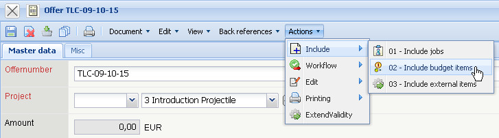 Next the planning data of the budget administration can also be included in the offer. The planed time/effort of the budget administration builds the basis of the offer preparation and can be displayed through the action “Include budget items”.