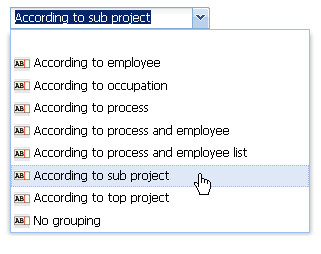 The print can be controlled in the intermediate dialogue. You can choose between printing according to a process, according to employees, according to sub-projects (display 1st level), according to an occupation or in one line with the total sum on the project level.