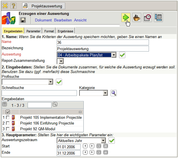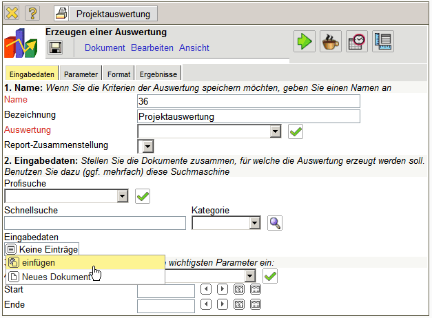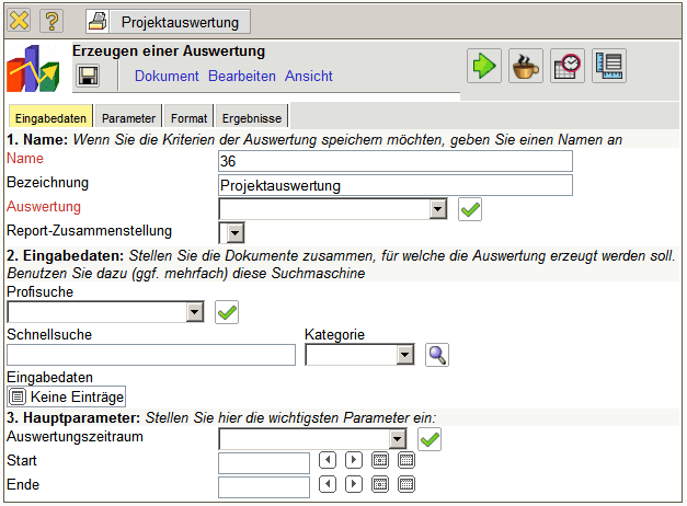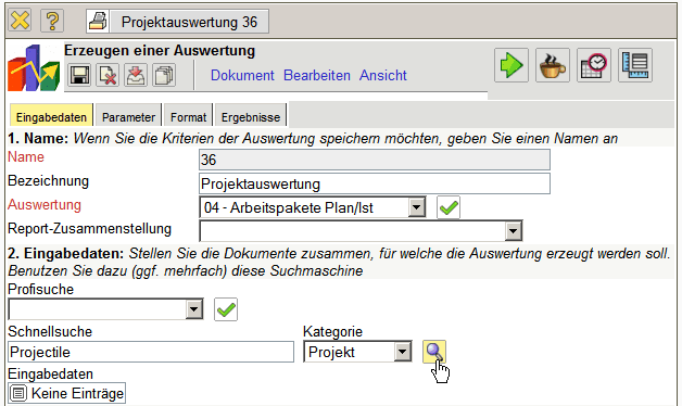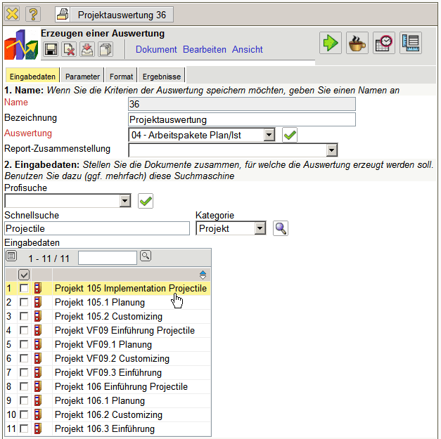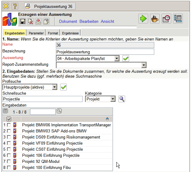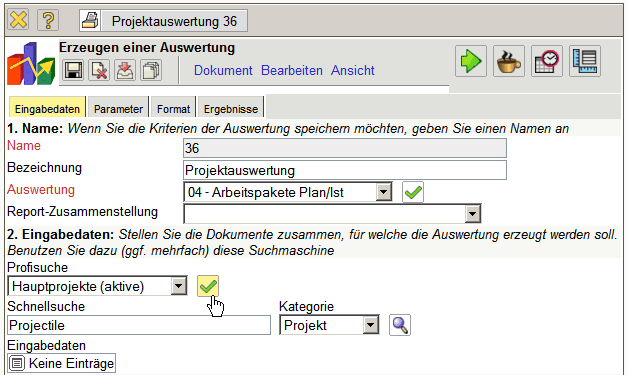 Nach Öffnen der Auswertungsart (hier die Projektauswertungen) öffnet sich ein Auswertungsdokument. Im Dokument können Selektionskriterien und Optionen der Auswertung konfiguriert werden.
