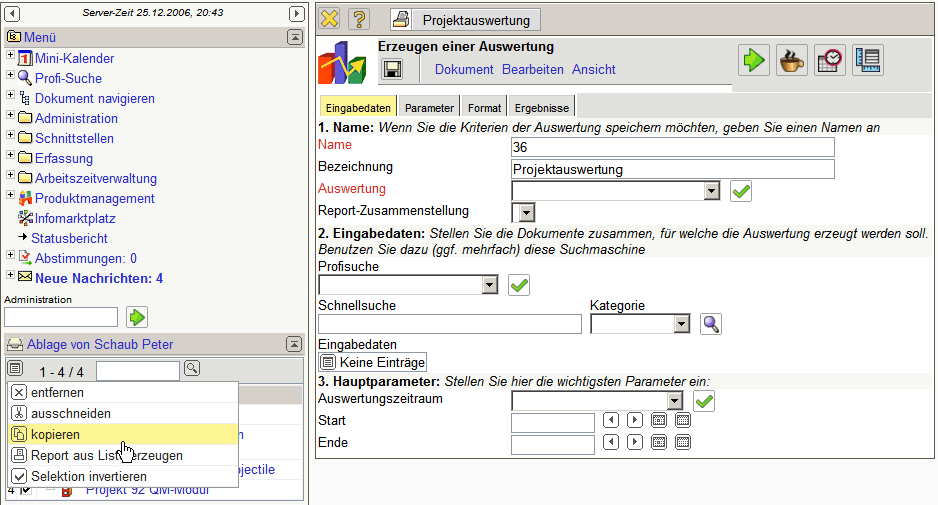 Durch das Schließen des Auswertungsergebnisses gelangt man wieder in den Auswertungsblock Projektauswertung.