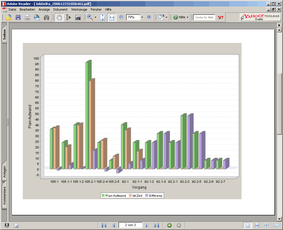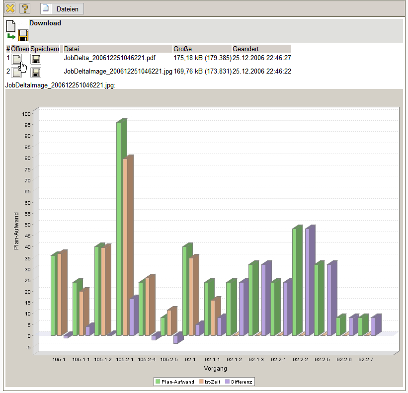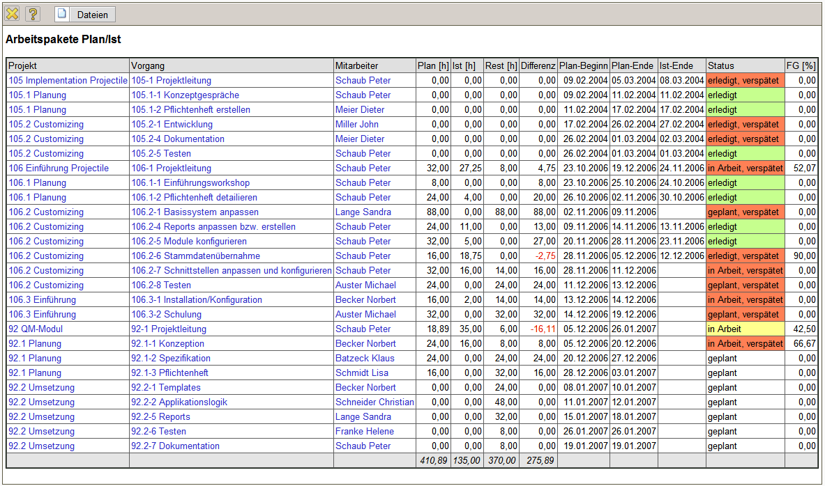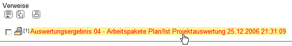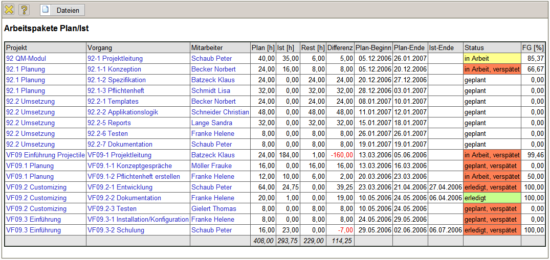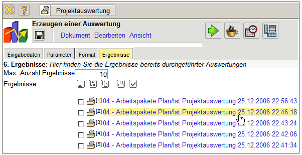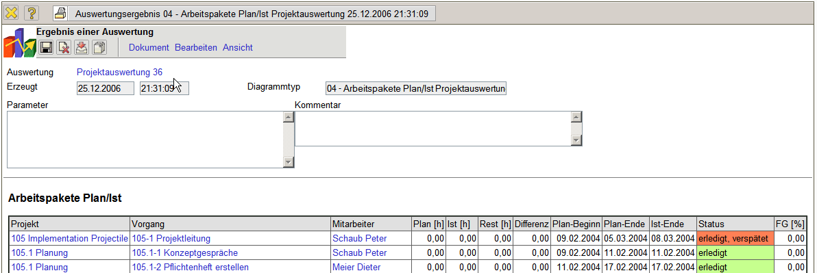 Wenn die Auswertungsergebnisse erzeugt sind, präsentiert das System das Ergebnis im Browser. Diese Auswertung beinhaltet Informationen bezüglich der Projekte, Vorgänge bzw. Arbeitspakete und Bearbeiter, der Plan- und Ist-Zeiten mit Restaufwand und der entsprechenden Differenz (Plan - Ist), den geplanten Abarbeitungszeitraum (Beginn/Ende) und die Statusinformationen (Status, Abschlussdatum und Fertigstellungsgrad der Aufgabe).