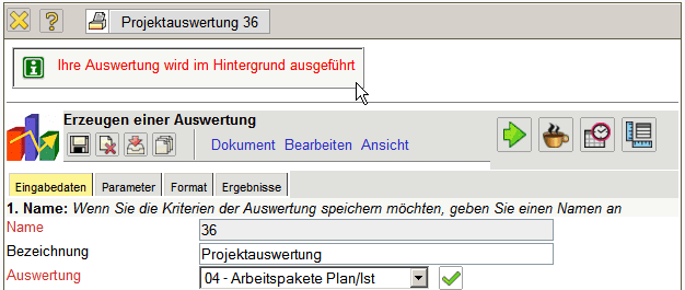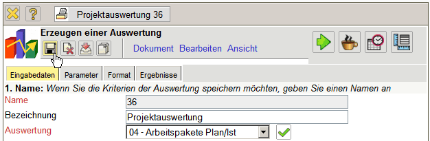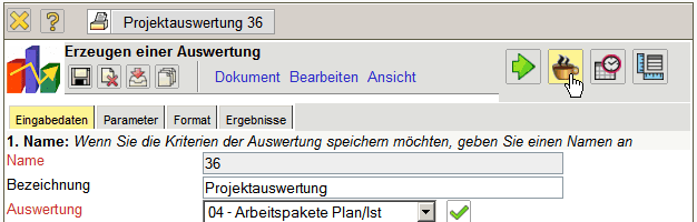 Im ersten Teil (1. Name) kann für die Auswertung ein Name vergeben werden, falls die Auswertung abgespeichert wird. Das Speichern der Auswertung ist sinnvoll, wenn die Selektionskriterien der Auswertungen konstant bleiben (beispielsweise eine Auflistung aller aktiven Projekte für das aktuelle Quartal). Diese abgespeicherte Auswertung kann in die persönliche Ablage übernommen werden oder die Basis für einen Zeitdienst darstellen, um Auswertungen zu automatisieren. Darüber hinaus können Auswertungen auch im Hintergrund erzeugt werden. Um die Auswertungsergebnisse anzuzeigen, muss die Auswertung ebenfalls abgespeichert sein.