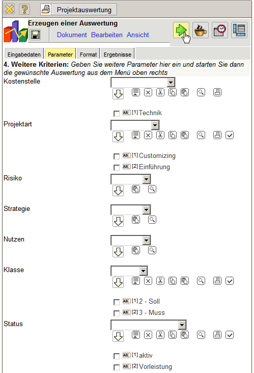 Anschließend kann der Betrachtungszeitraum (3. Hauptparameter) und die weiteren Kriterien verwendet werden (4. Parameter), um die Ergebnisse der Auswertungen sinnvoll einzuschränken. Zu diesen Parametern gehört beispielsweise die Kostenstelle des Projektes, die Projektart, der Projektstatus, die Priorität und das Kennzeichen, ob das Projekt ein externer Auftrag ist oder nicht. Die weiteren Optionen betreffen die Filterung von Ergebnissen.