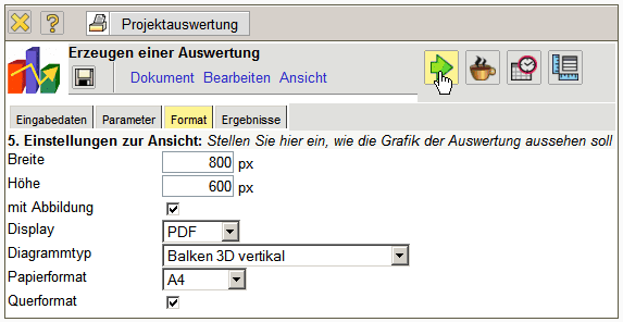 Auf dem Reiter “Format” (5. Einstellungen zur Ansicht) können beispielsweise die Breite der Abbildungen in Pixel und der Diagrammtyp ausgewählt werden.