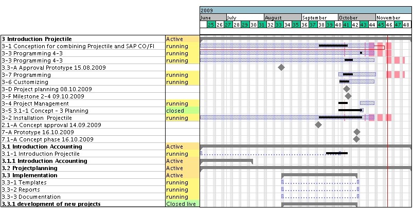 Project controlling is a method for early detection of project differences using comparisons of plan results and actual results. To evaluate the differences, a project report or an evaluation of the project manager is applied. The procedure for project controlling must already be specified in the project order. In Projectile charts for controlling purposes (target/actual comparisons for projects, jobs and times) are generated in the project charts .