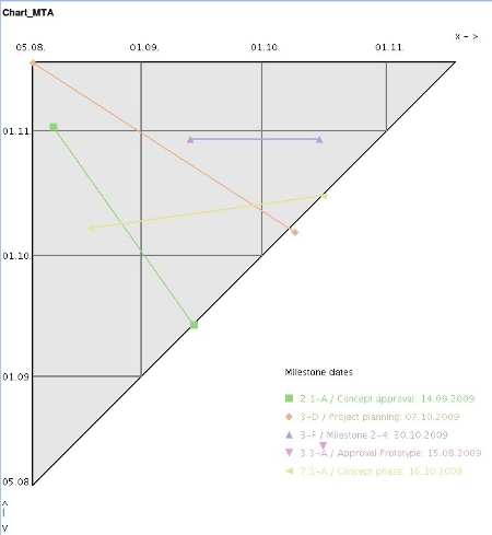 The milestone-trend-analysis is a future-related tool for controlling the schedule of a project: On periodical reporting dates the schedule of the project is re-estimated through retrieving trend data of the estimated milestone achievement. From the curve progression, a trend can be inferred through the adherence of deadlines of the project. The deadlines for the milestones can be administered in the document type deadlines and the analysis is visualized in the project chart.
