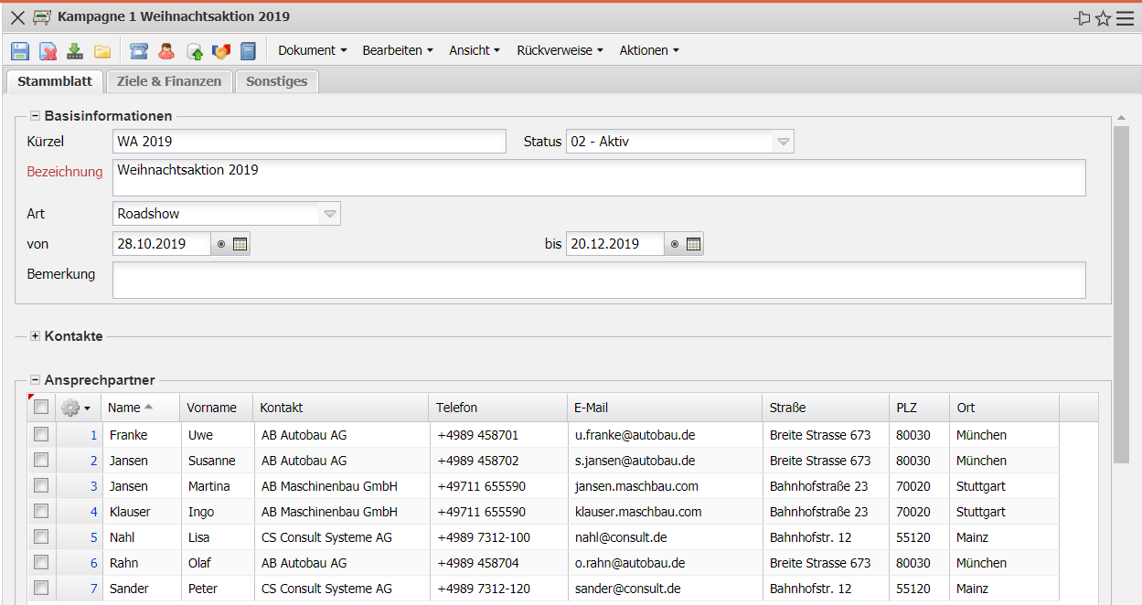 Die Maske Kampagne verwaltet die Marketing- und Vertriebskampagnen im System. Hier werden u.a. der Verantwortliche der Kampagne, die Klasse und der Status, der Zeitraum, die Zielgruppe und Ziele sowie die finanziellen Eckwerte der Kampagne aufgeführt.