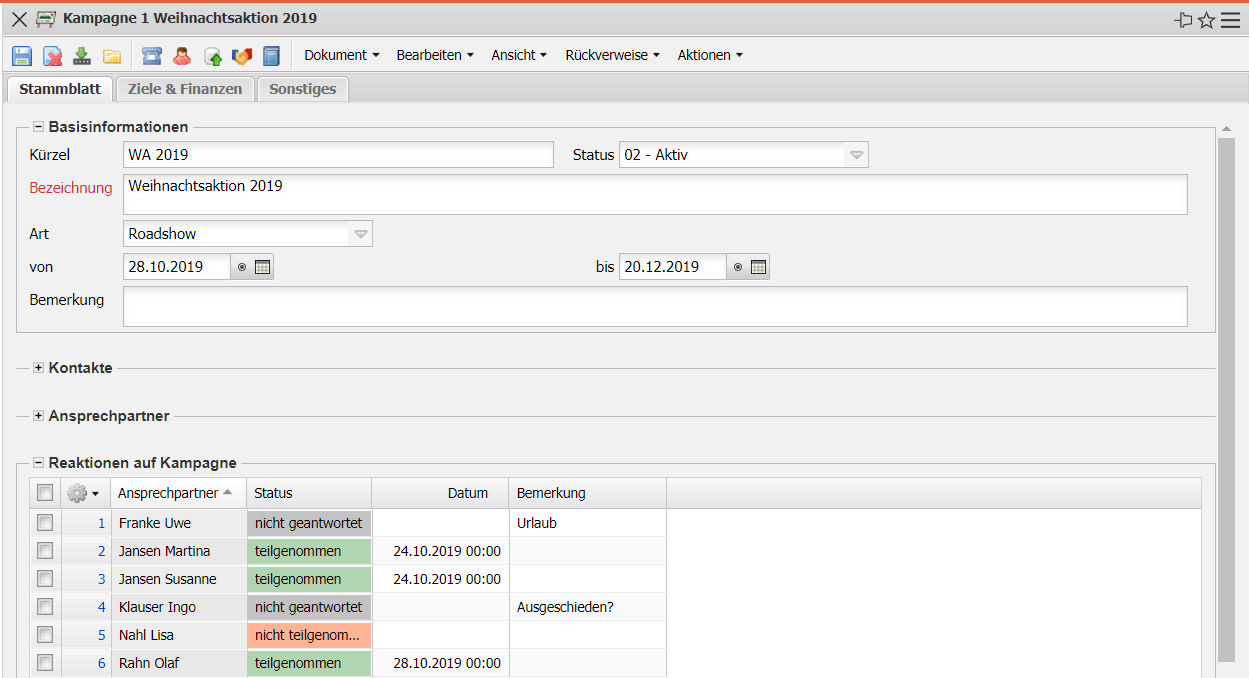 - Reaktionen auf Kampagne: In diesem Feld können die Reaktionen auf die Kampagne für die einzelnen Ansprechpartner eingefügt werden.