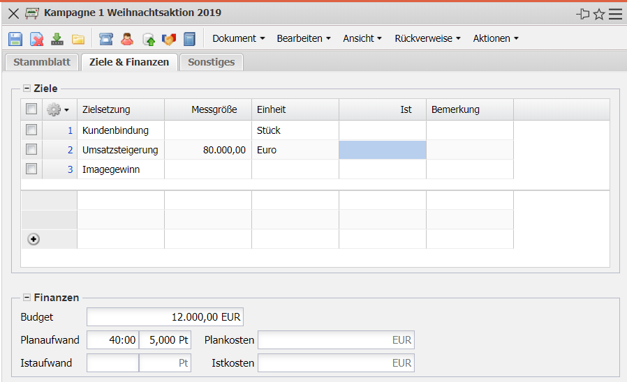 - Ist-Aufwand: Hier werden die erbrachten Aufwände der Kampagne eingetragen.