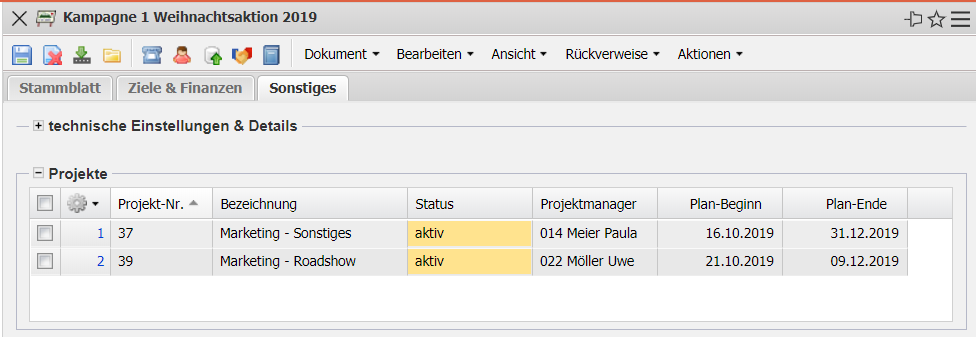 - Projekte: Hier können die Projekte zugeordnet werden, die über Kampagnen gewonnen worden sind. Die Projekte können in der Maske Projekte definiert und geändert werden.