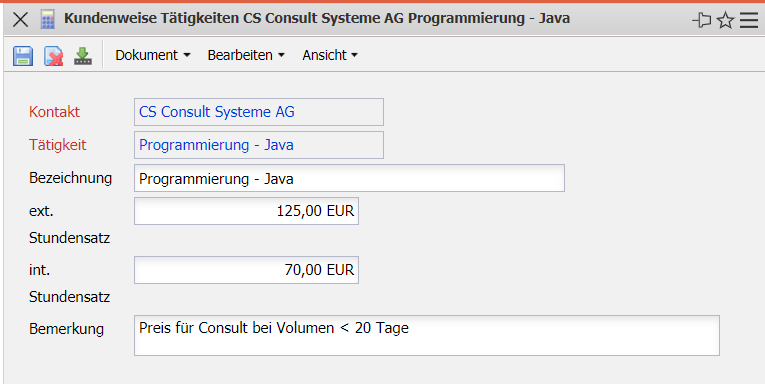 - Externer Stundensatz: Hier wird der externe Berechnungssatz pro Stunde dieser Tätigkeit festgelegt. Dieser Satz wird dann (wenn keine projektbezogene Änderung vorliegt) für die Angebots- und Rechnungsstellung verwendet.