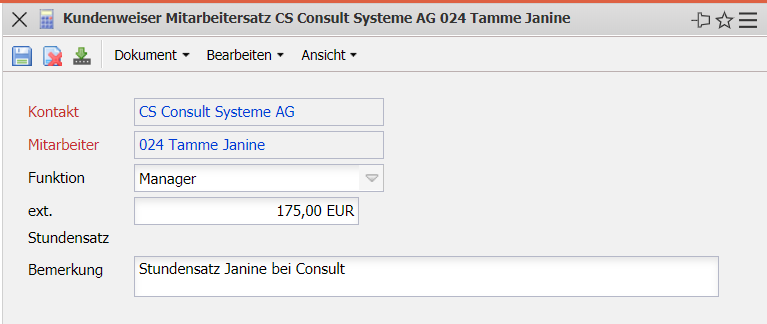 Die Maske Kundenweiser Mitarbeitersatz verwaltet die Externen Stundensätze, die abweichend von den Standardsätzen (in der Regel definiert in den Tätigkeiten) für einen bestimmten Kunden verwendet werden.